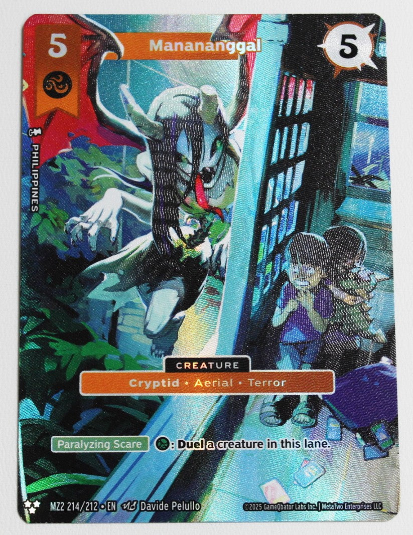 This highly sought-after alternate art card from the 2025 MetaZoo Torrential Tides set features the Manananggal, a creature from Filipino folklore known for its ability to sever its upper torso and take flight. As card 214/212, this is a coveted secret rare that extends beyond the base set numbering, making it a premium collectible for serious MetaZoo players and collectors. The alternate artwork offers a unique visual interpretation of this mythical beast, distinguishing it from the standard version. Whether you're building a competitive deck or curating a collection of rare MetaZoo cards, this Manananggal variant represents both strategic gameplay value and investment potential in the expanding MetaZoo trading card game universe.