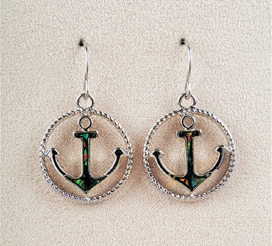 These Wild Pearle abalone dangle earrings showcase the natural iridescence of premium abalone shell, featuring an anchor motif that captures nautical elegance. The shimmering surface displays the characteristic play of light across greens, blues, and purples inherent to quality abalone. Suspended from secure ear wires, these pieces offer a refined coastal aesthetic suitable for both everyday wear and special occasions. The anchor design adds meaningful symbolism while the lightweight construction ensures comfortable all-day wearability.