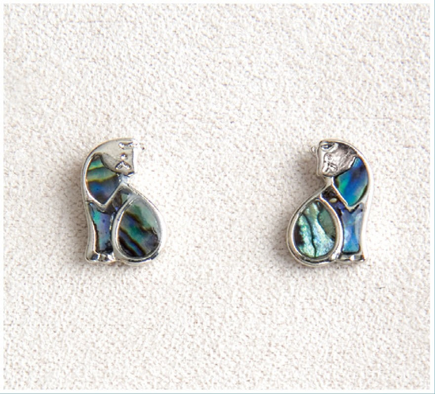 Wild Pearle Abalone Earrings Cat These striking cat-shaped earrings showcase the natural iridescence of genuine abalone shell, featuring the signature play of blues, greens, and purples characteristic of this marine material. Each piece captures the whimsical feline form with refined detail, making them an ideal choice for cat enthusiasts and collectors of nature-inspired jewelry. The abalone's lustrous finish adds sophistication to any ensemble, while the lightweight construction ensures comfortable all-day wear. A distinctive accessory that merges artisanal craftsmanship with organic beauty.