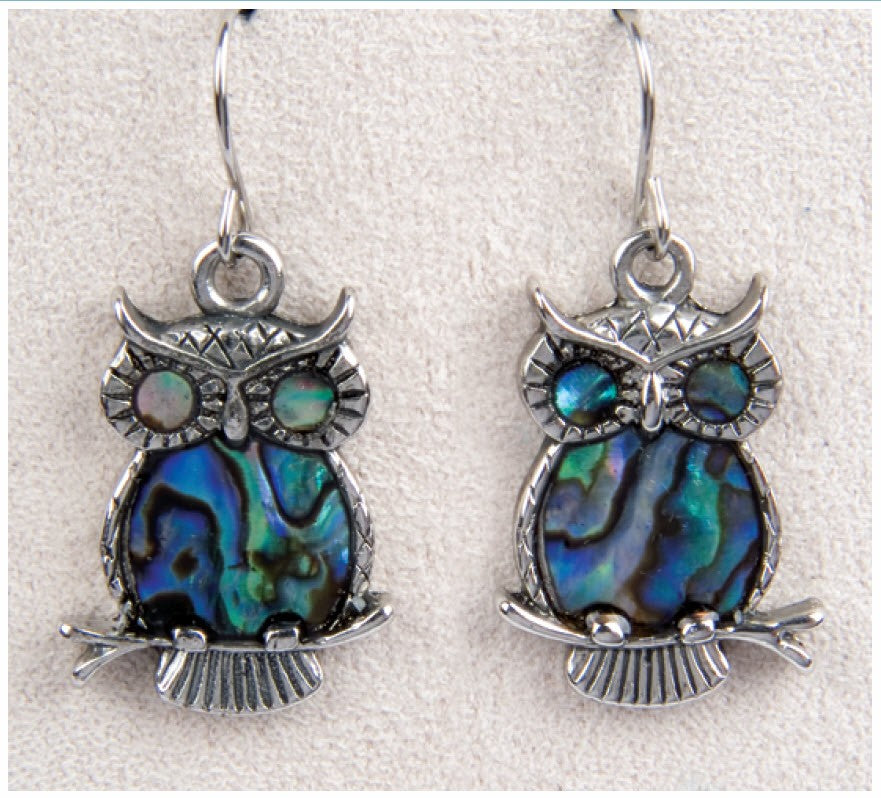 These Wild Pearle abalone dangle earrings showcase an enchanting owl design crafted with iridescent abalone shell. The natural mother-of-pearl material displays shifting hues of green, blue, and purple that catch the light beautifully. Each pair features expertly carved details that bring the owl motif to life, making them a distinctive accessory for those who appreciate artisanal jewelry. The dangling style adds graceful movement, while the abalone's organic luster ensures these earrings remain timeless pieces that complement both casual and refined wardrobes.