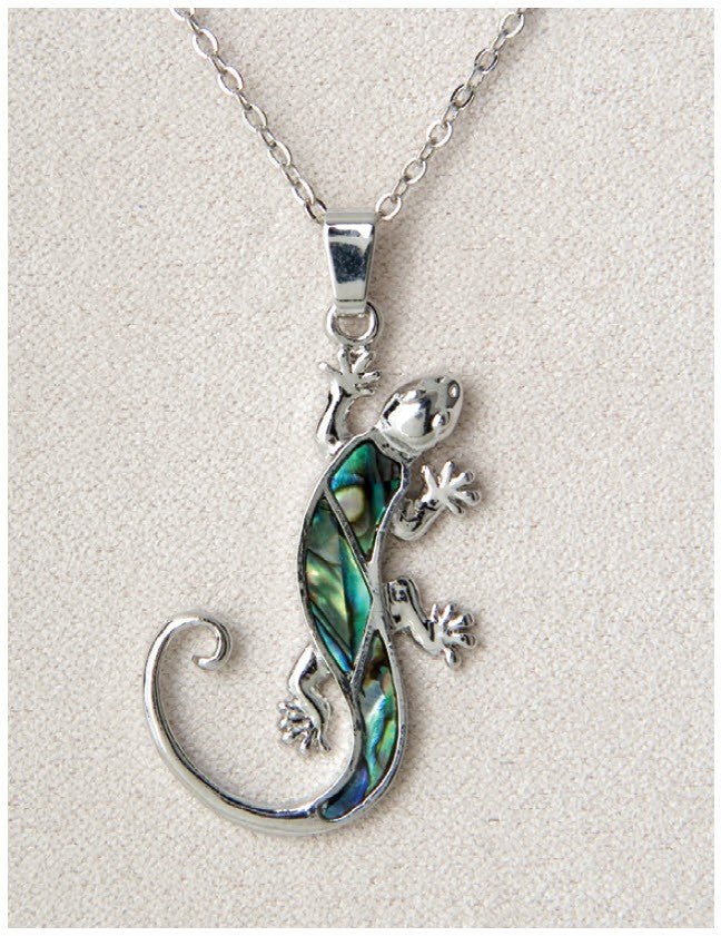 This striking gecko pendant showcases genuine abalone shell, prized for its iridescent play of color that shifts across blues, greens, and purples. The intricate detailing captures the gecko's distinctive form with remarkable precision, making it a conversation piece for nature enthusiasts and jewelry collectors alike. Suspended from a quality necklace, this piece combines artisanal craftsmanship with the natural beauty of abalone, offering a wearable tribute to wildlife. Perfect for those who appreciate unique, statement-making accessories with authentic materials and thoughtful design.