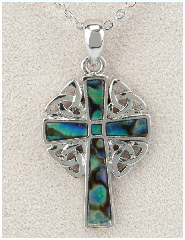 This striking Celtic cross pendant showcases the natural iridescence of abalone shell, creating a mesmerizing play of blues, greens, and purples with every movement. The intricate Celtic knotwork design honors traditional symbolism while the lustrous abalone inlay adds contemporary elegance. Suspended from a quality necklace, this piece serves as both a meaningful spiritual symbol and a distinctive fashion statement. Perfect for those who appreciate artisanal craftsmanship and the timeless appeal of Celtic heritage.