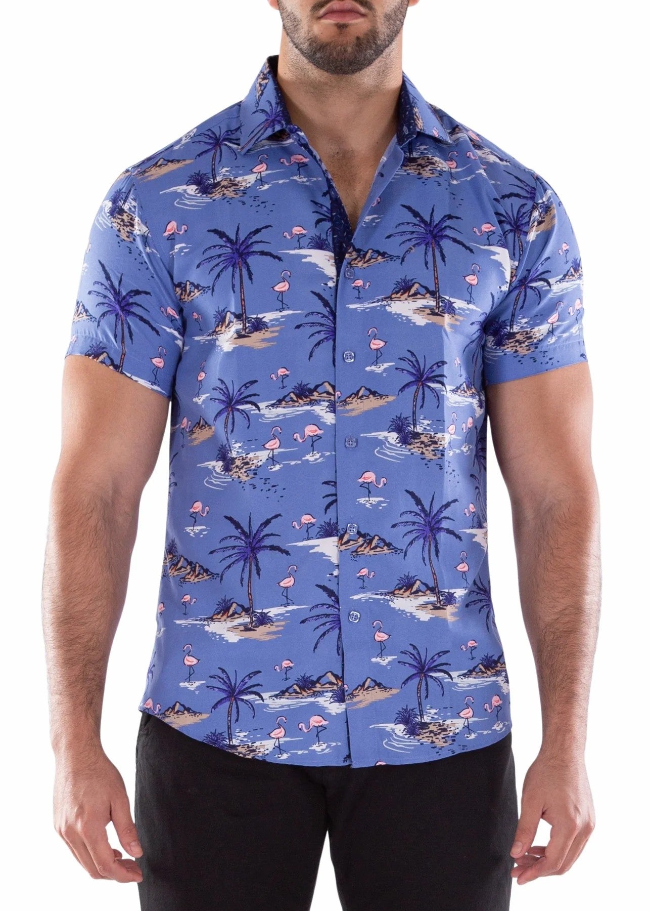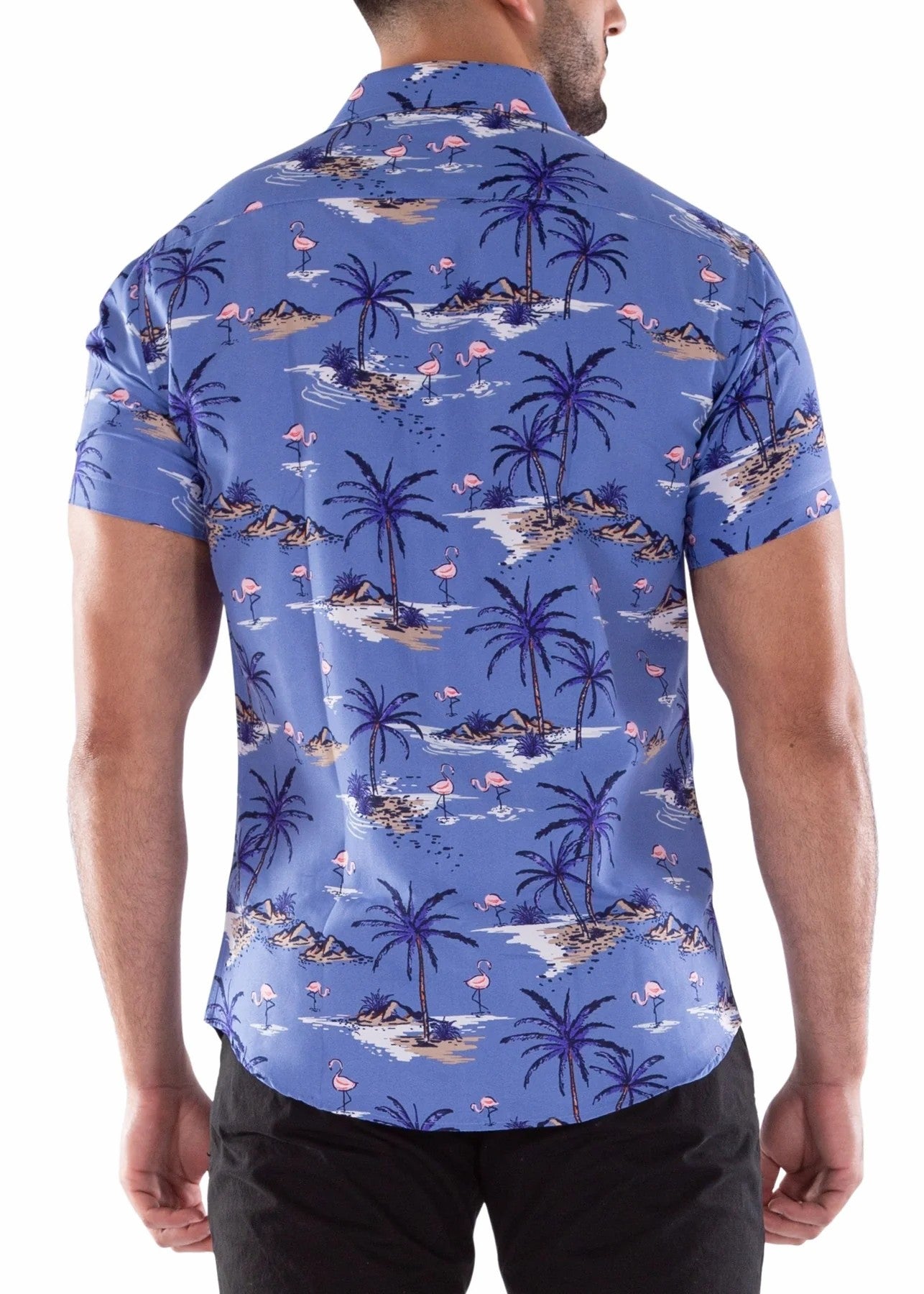 Men's Blue Button Up Short Sleeve Shirt Palm Trees