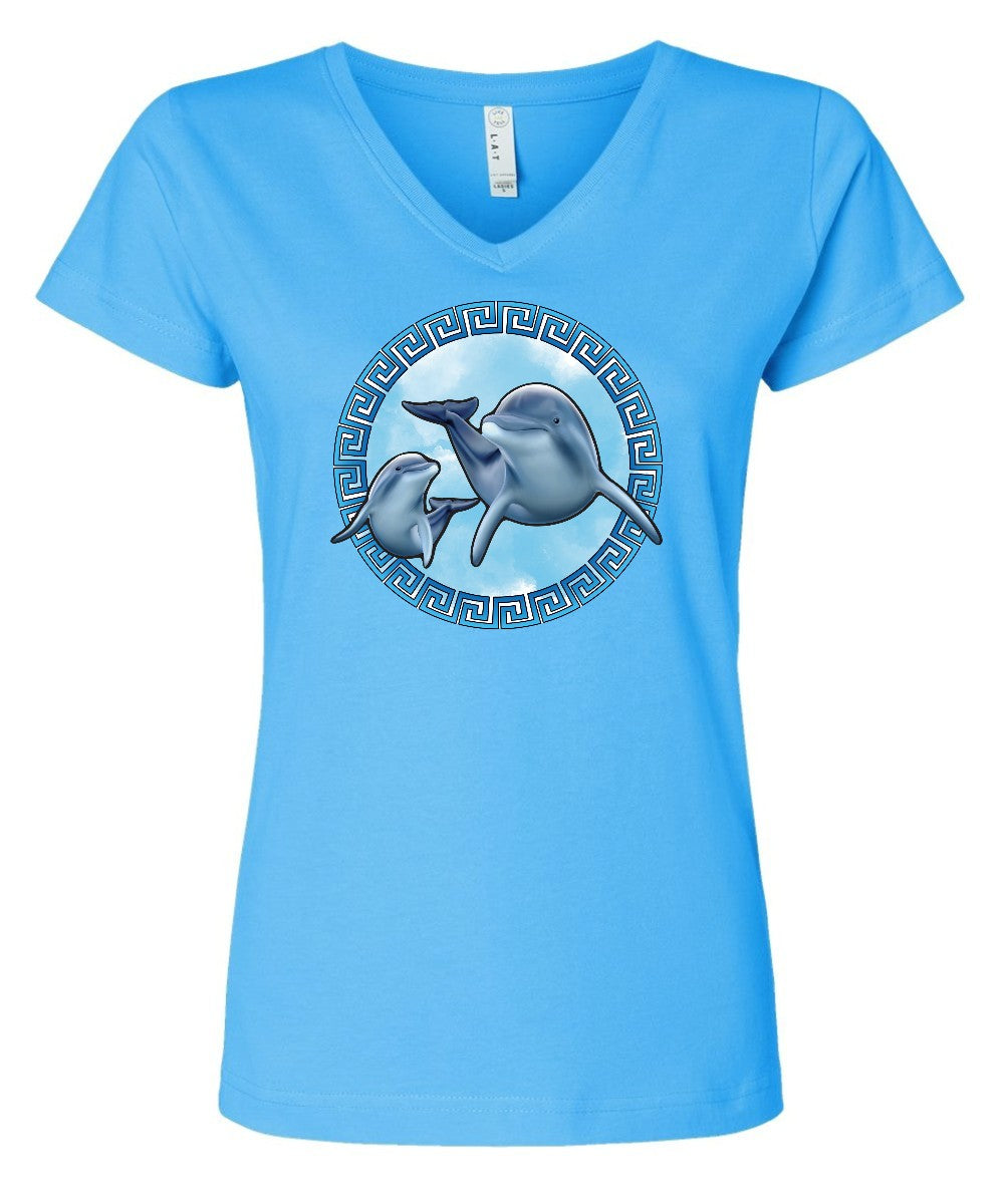 Elevate your wardrobe with this sophisticated aqua top, featuring an elegant Greek key pattern inspired by timeless design principles. The flattering V-neckline creates a refined silhouette while the dolphin motif adds a distinctive coastal charm. Crafted for comfort and style, this piece transitions seamlessly from casual daytime wear to evening occasions. The aqua hue complements a variety of skin tones and pairs effortlessly with neutral or complementary separates. Perfect for those who appreciate quality craftsmanship and understated elegance.