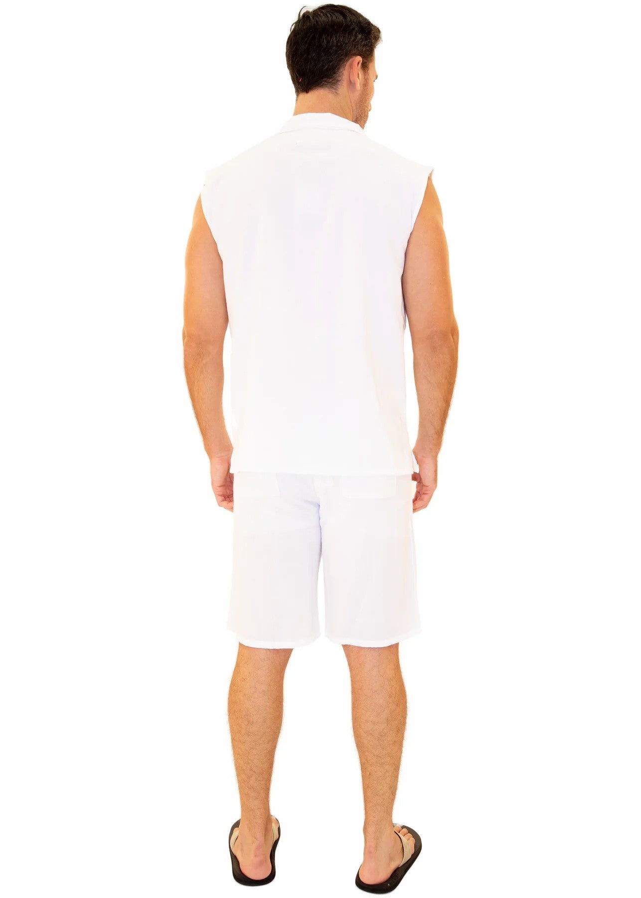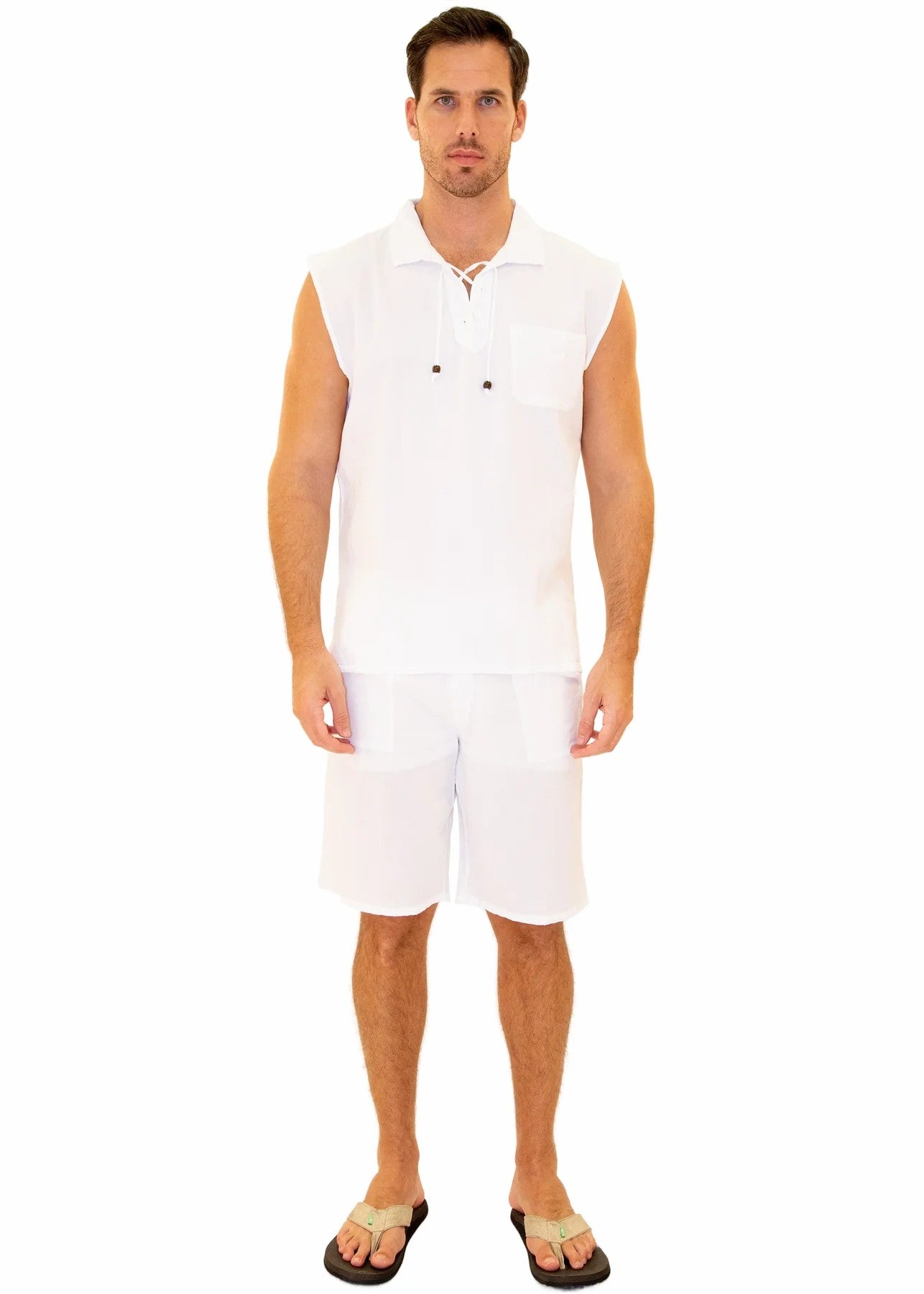 Men's White Cotton Drawstring Pocket Sleeveless Shirt