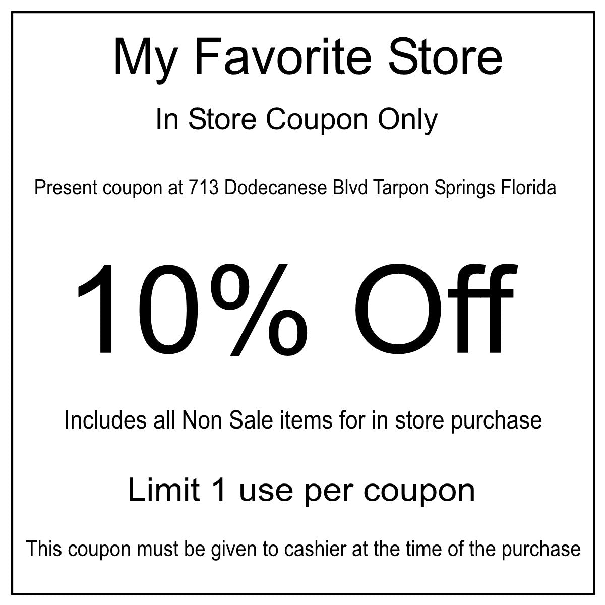 My Favorite Store Coupon is to be used in store only at 713 Dodecanese Blvd Tarpon Springs, Florida. Receive 10% off. Limit 1 use per coupon.