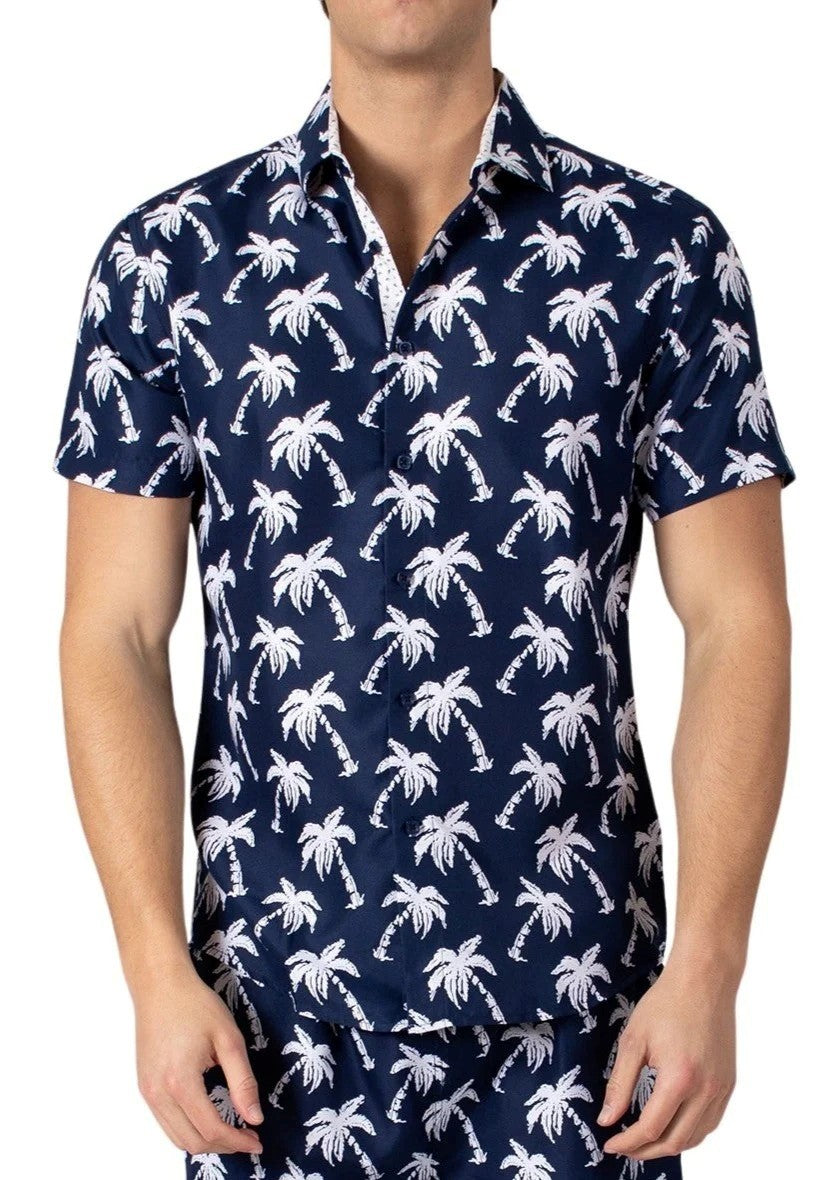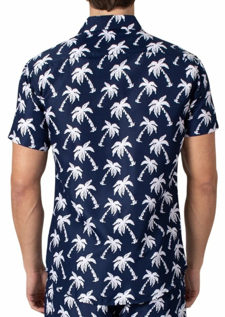 Navy Tropical Print Palm Tree Short Sleeve Shirt