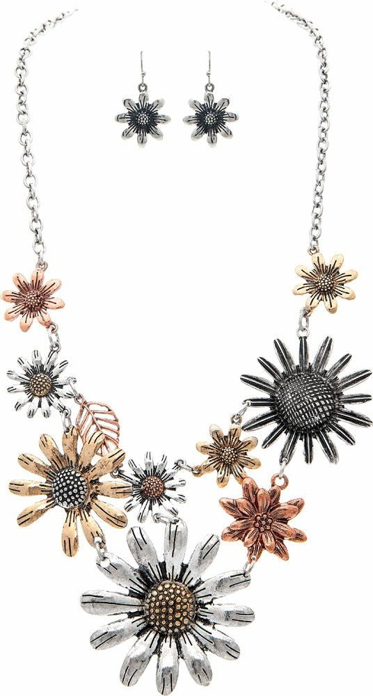 Silver Big Flowers Statement Necklace Set