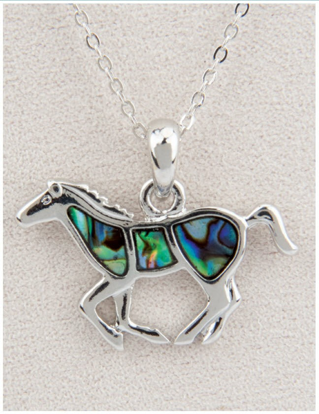 This striking necklace features a stunning abalone pendant shaped like a stallion, showcasing the natural iridescence and color-shifting properties that make abalone such a prized material. The Wild Pearle design captures the wild spirit and untamed beauty of these magnificent horses, with the shell's luminous surface reflecting blues, greens, and purples as it catches the light. Perfect for those who appreciate nature-inspired jewelry with artistic flair, this piece combines craftsmanship with the organic elegance of genuine abalone. An ideal accessory for equestrian enthusiasts or anyone drawn to distinctive, conversation-starting jewelry.