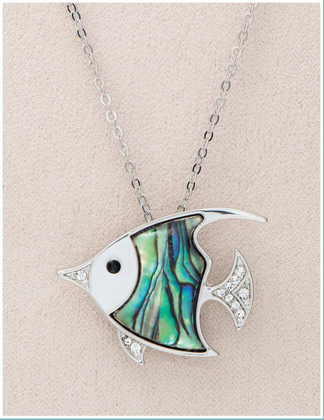 This striking necklace features a genuine abalone shell pendant carved into a tropical fish design, showcasing the natural iridescence and color-shifting properties abalone is prized for. The shell's luminous surface displays blues, greens, and purples that catch the light beautifully. Suspended from a delicate chain, this piece combines oceanic elegance with artisanal craftsmanship, making it an ideal accessory for those who appreciate nature-inspired jewelry with authentic materials and distinctive character.